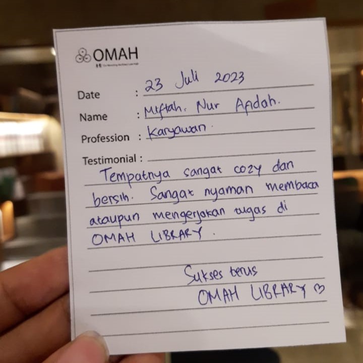 Tempatnya cozy dan bersih. Sangat nyaman membaca ataupun mengerjakan tugas di OMAH LIBRARY. Sukses terus Omah Library. ❤