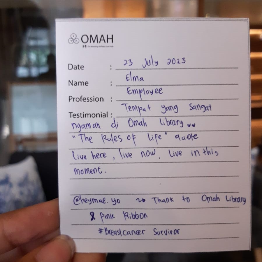 Tempat yang sangat nyaman di Omah Library. “The Rules Of Life” quote live here, live now, live in this moment. Thank to Omah Library. Pink ribbon. #Breast cancer survivor.
