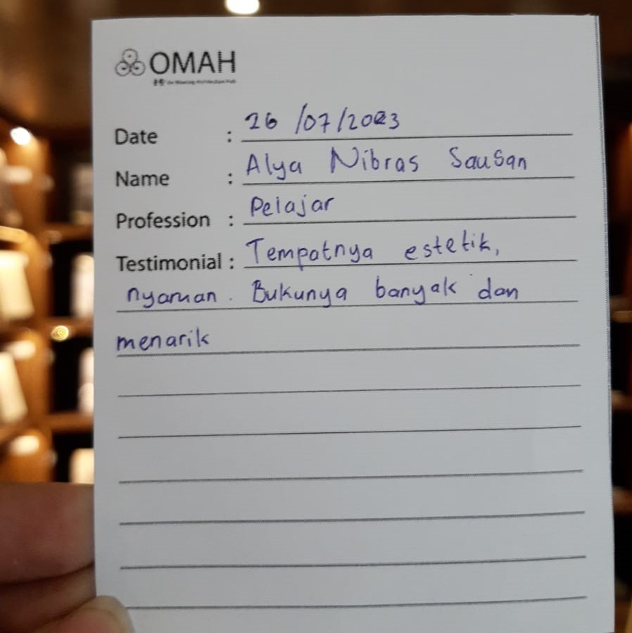 Tempatnya nyaman, tenang, sejuk, pas untuk belajar dan bekerja. Dapat inspirasi-inspirasi tentang arsitektur baik dari buku maupun bangunan Omah Library sendiri. Senang sekali berada di sini terutama bersama teman. Cocok untuk menghabiskan waktu yang bermanfaat. Semoga tempat ini semakin banyak orang yang tau.