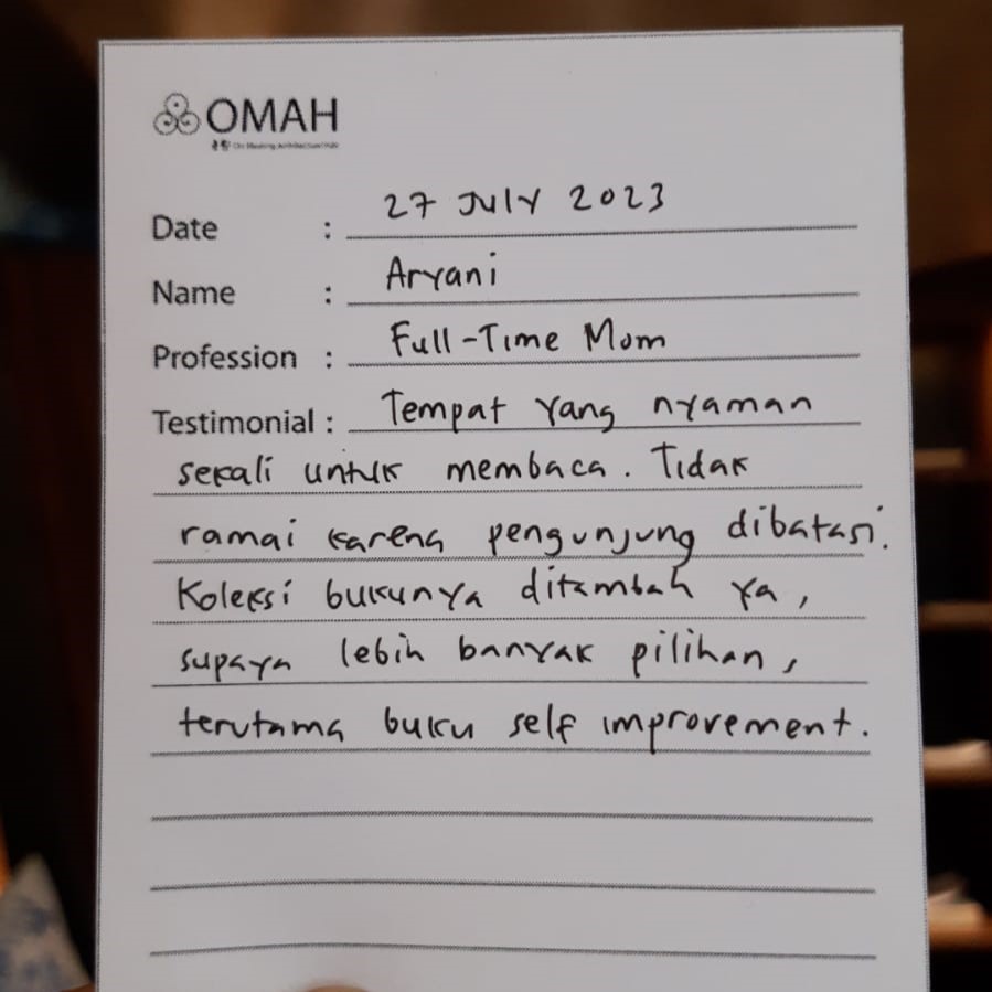 Tempat yang nyaman sekali untuk membaca. Tidak ramai karena pengunjung di batasi. Koleksi bukunya ditambah ya, supaya lebih banyak pilihan, terutama buk self improvement.