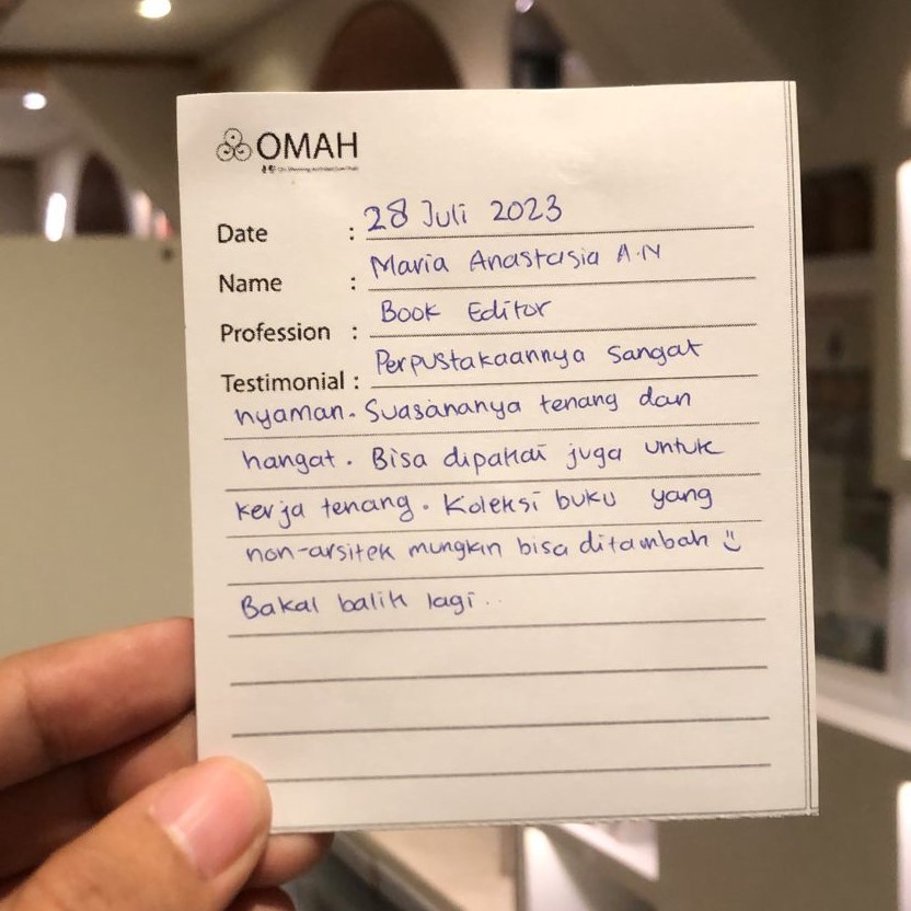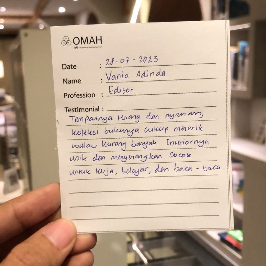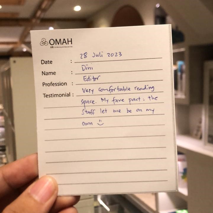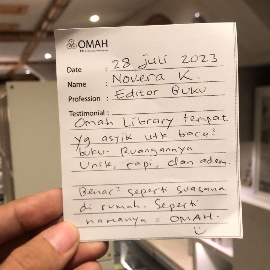 Omah Library tempat yang asyik untuk baca-baca buku. Ruangannya unik, rapi, dan adem. Benar-benar seperti suasana di rumah. Seperti namanya, OMAH.