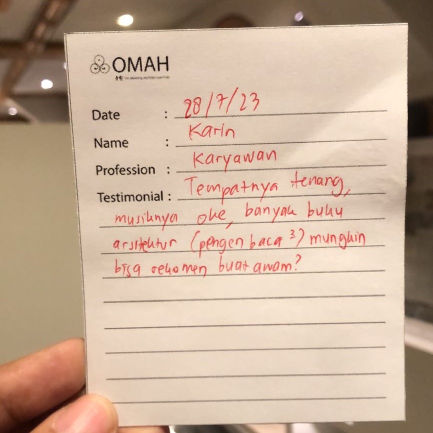 Tempatnyatenang, musiknya oke, banyak buku arsitektur (pengen baca-baca) mungkin bisa rekomend buat awam?