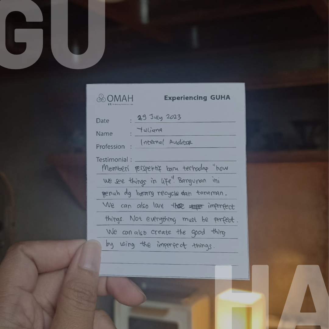 Memberi perspektif baru terhadap “how we see things in life”. Bangunan ini penuh dengan barang recycle dan tanaman. We can also love imperfect things. Not everything must be perfect. We can also create the good thing by using the imperfect things.