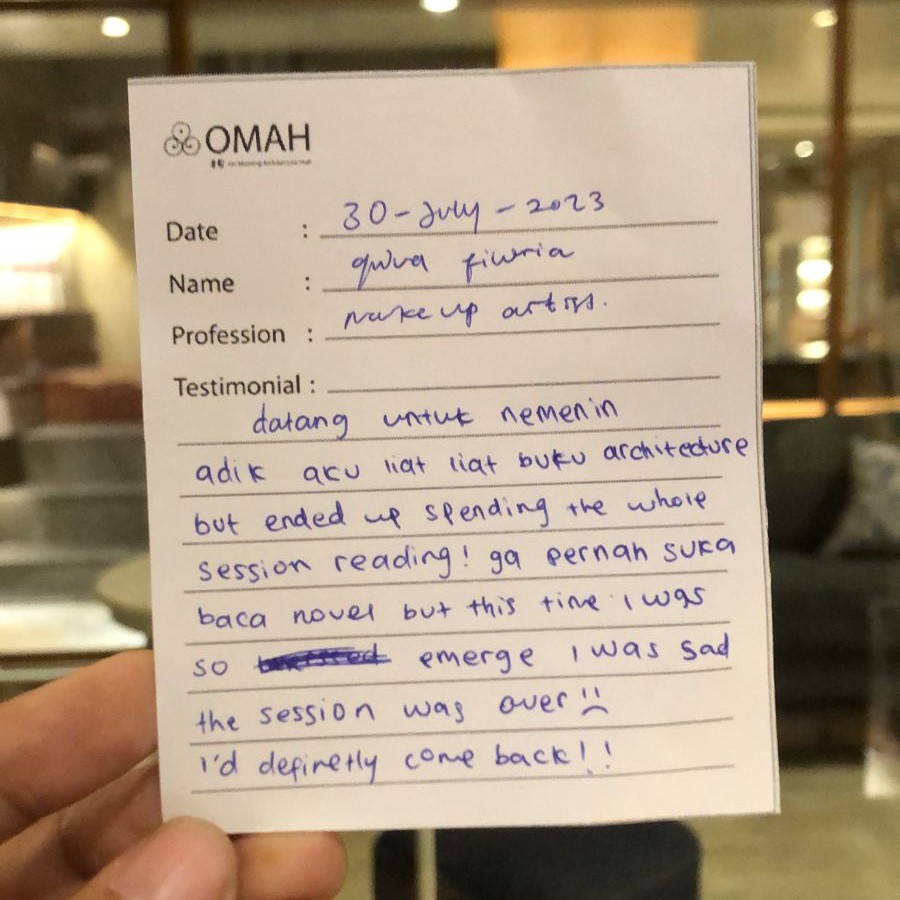 Datang nemenin adik aku liat-liat buku architecture but ended up spending the whole session resding! ga pernah suka baca novel but this time i was so emerge i was sad the session was over 😦 I’d definitely come back!!