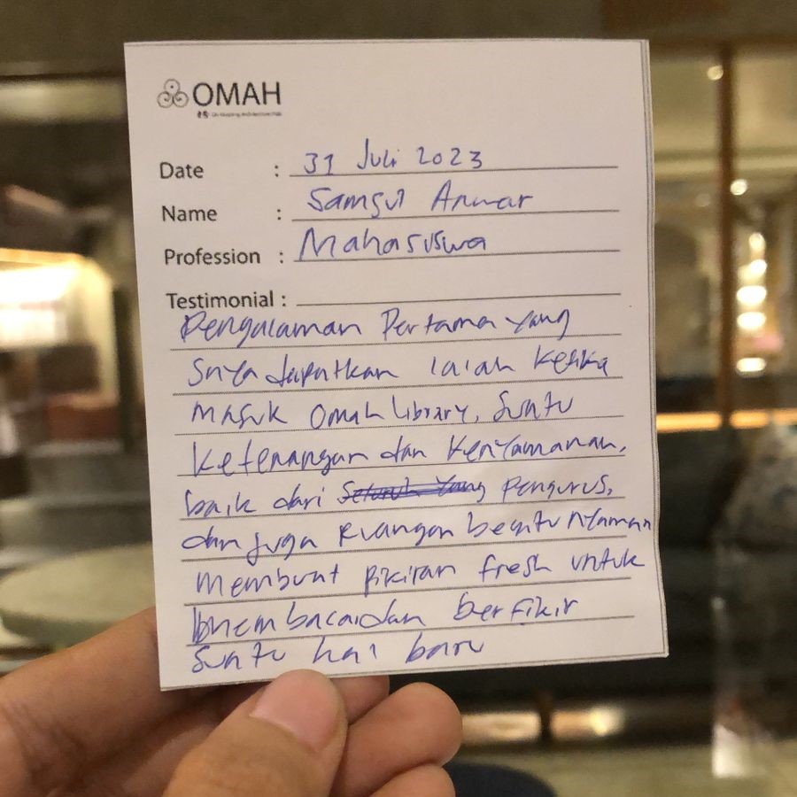 Pengalaman pertama yang saya dapatkan ialah ketika masuk Omah Library, suatu ketenangan dan kenyamanan baik dari pengurus dan juga ruangan begitu nyaman membuat pikiran fresh untuk membaca dan berfikir suatu hal baru.