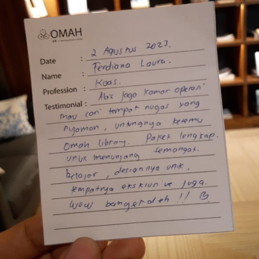 Abis jaga kamar operasi, mau cari tempat nugas yang nyaman, untungnya ketemu Omah Library. Paket lengkap untuk menunjang semangat belajar, desainnya unik, tepatnya eksklusif juga. Wow banget deh!!<3