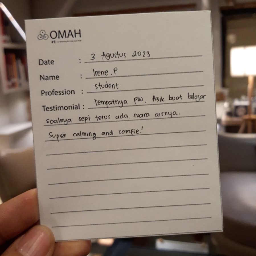 Tempatnya PW. Asik buat belajar soalnya sepi terus ada suara airnya. Super calming and comfie!