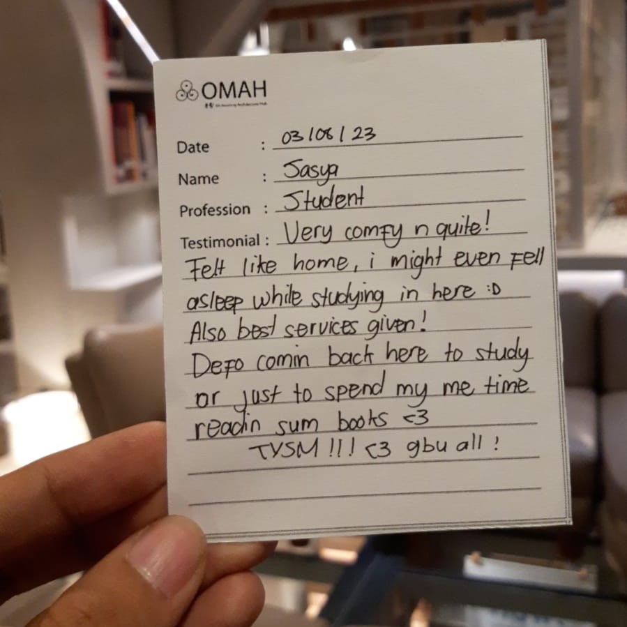 Very comfy anf quite ! felt like home, i might! even fell a sleep while studting in here ;D also best services given! defo comin back hare to study or just to spend me time reading sum books. ❤ TVSM!!! ❤ GBU all!