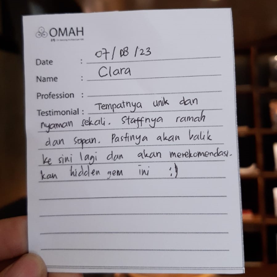 Tempatnya unik dan nyaman sekali, staff-nya ramah dan sopan. Pastinya akan balik ke sini lagi dan akan merekomendasikan hidden gem ini : )