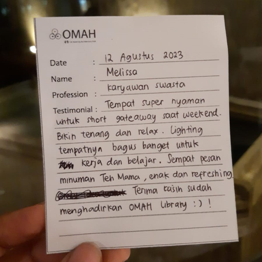 Tempat super nyaman untuk short gateaway saat weekend. Bikin tenang dan relax. Lighting tempatnya bagus banget untuk kerja dan belajar. Sempat pesan minuman Teh Mama, enak dan refreshing. Terimakasih sudah menghadirkan Omah Library:)