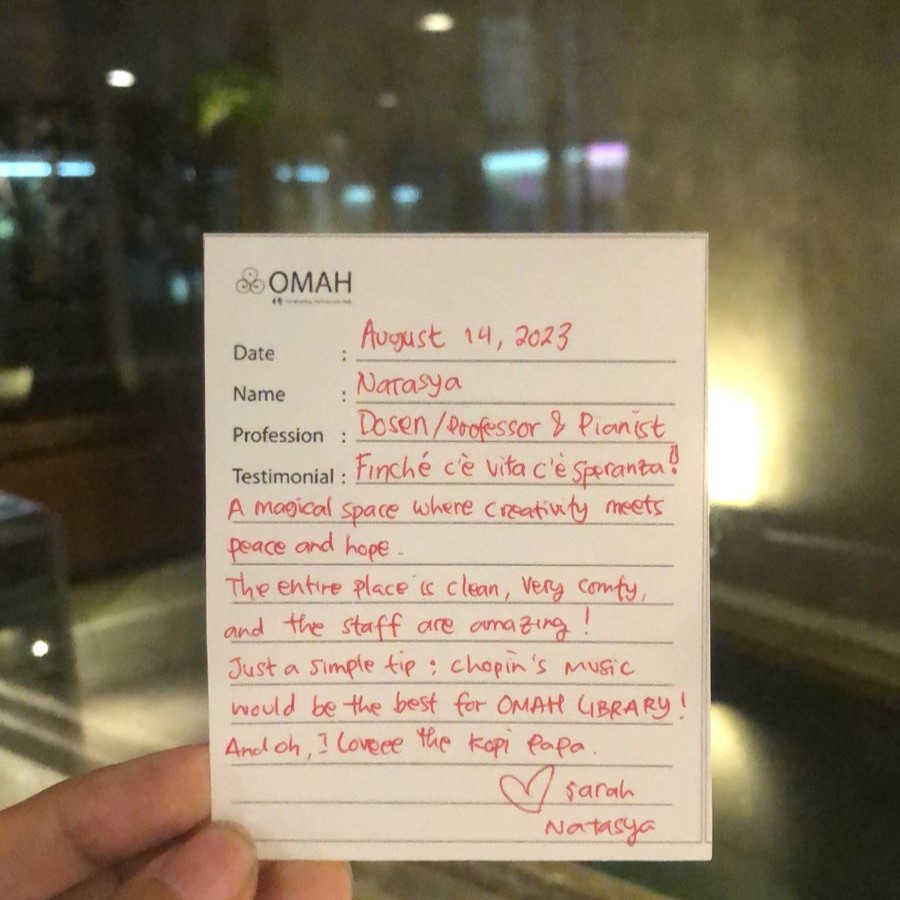 Finche’ c’e vita c’e speranza! A magical space where creativity meets peace and hope. The entire place is clean, very comfy, and the staff are amazing! Just a simple tip : chopin’s music would be the best for Omah Library! And oh, i love the Kopi Papa.