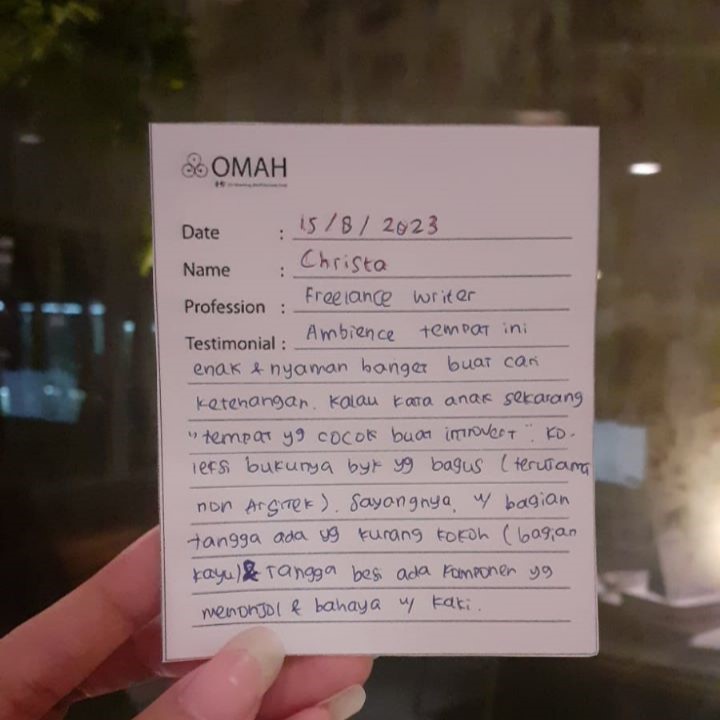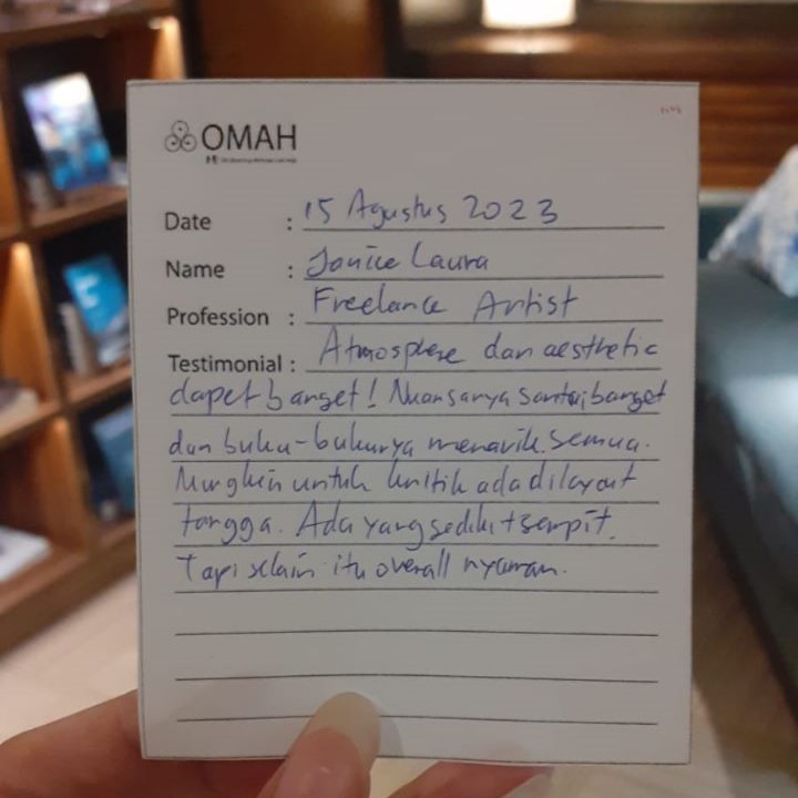 Atmosphere dan aesthetic dapet banget! Nuansanya santai banget dan buku-bukunya menarik semua. Mungkin untuk kritik ada di layout tangga. Ada yang sedikit sempit. Tapi selain itu overall nyaman.ta yang langsung saya rasain untuk Omah Library “warm”, sangat nyaman dan wajib didatengin.
