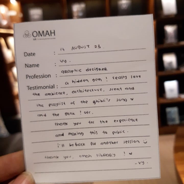 A hidden gem! really love the ambience, architecture, scent and the playlist of the ghibli’s song and the book! etc. Thank you the experince and making this to public. I’ll be back for another session 😉 thank you, Omah Library!
