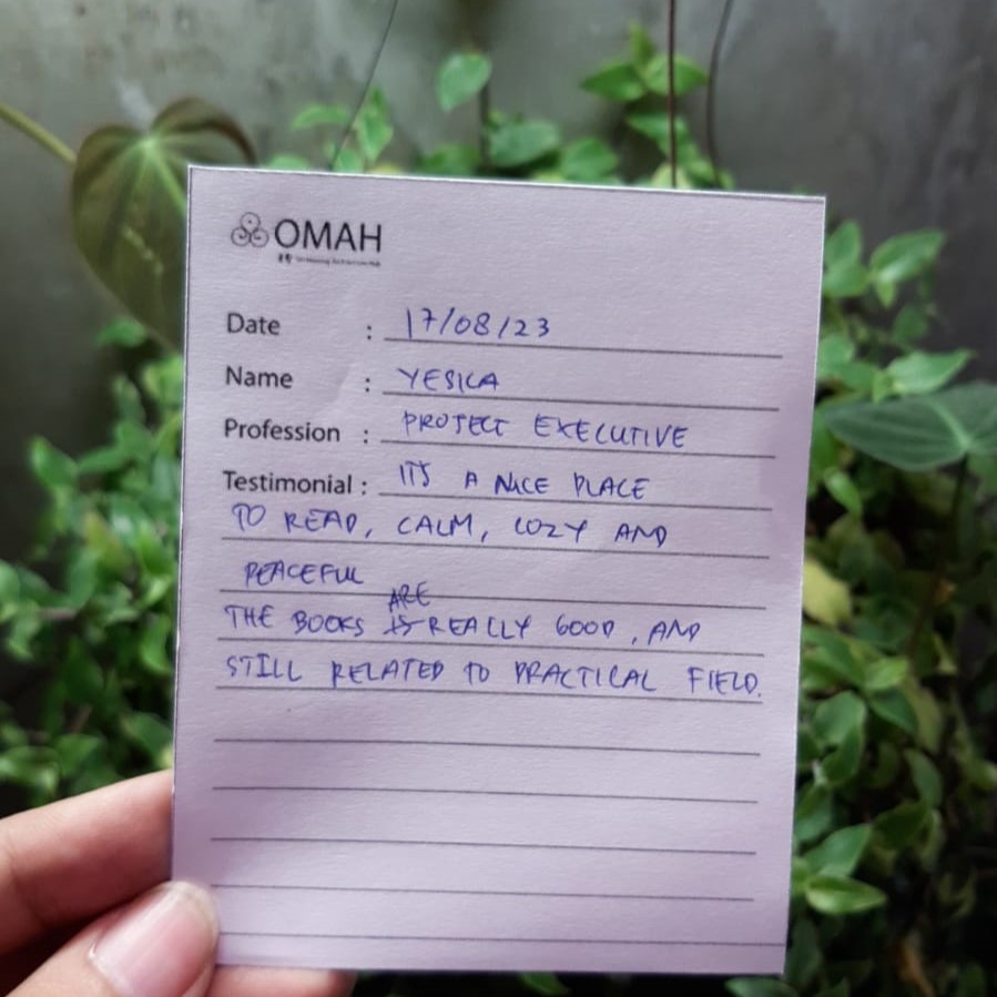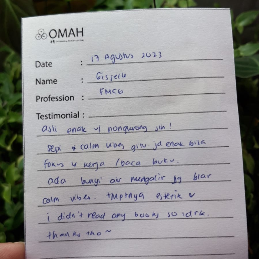 Asli enak untuk nongkrong sih! sepi & calm vibes gitu jadi enak bisa fokus kerja atau baca buku. ada bunyi air mengalir juga biar calm vibes. Tempatnya estetik. I didn’t read any books so drk . Thanks you.