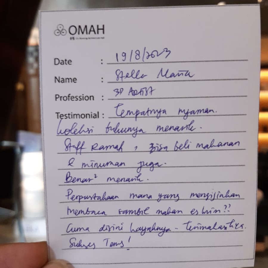 Tempatnya nyaman, Koleksi bukunya menarik. Staff ramah, BIsa beli makanan & minuman juga. Benar-benar menarik. Perpustakaan mana yang mengijinkan membaca sambil makan es krim. Cuma disini kayaknya. Terima kasih ya. Sukses terus!