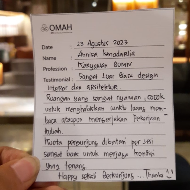 Sangat luar biasa design interior dan arsitektur. Ruangan yang sangat nyaman, cocok untuk menghabiskan waktu luang membaca ataupun mengerjakan pekerjaan kuliah. Kuota pengunjung dibatasi per-sesi sangat baik untuk menjaga kondisi yang tenang. Happy sekali berkunjung…Thanks 😊