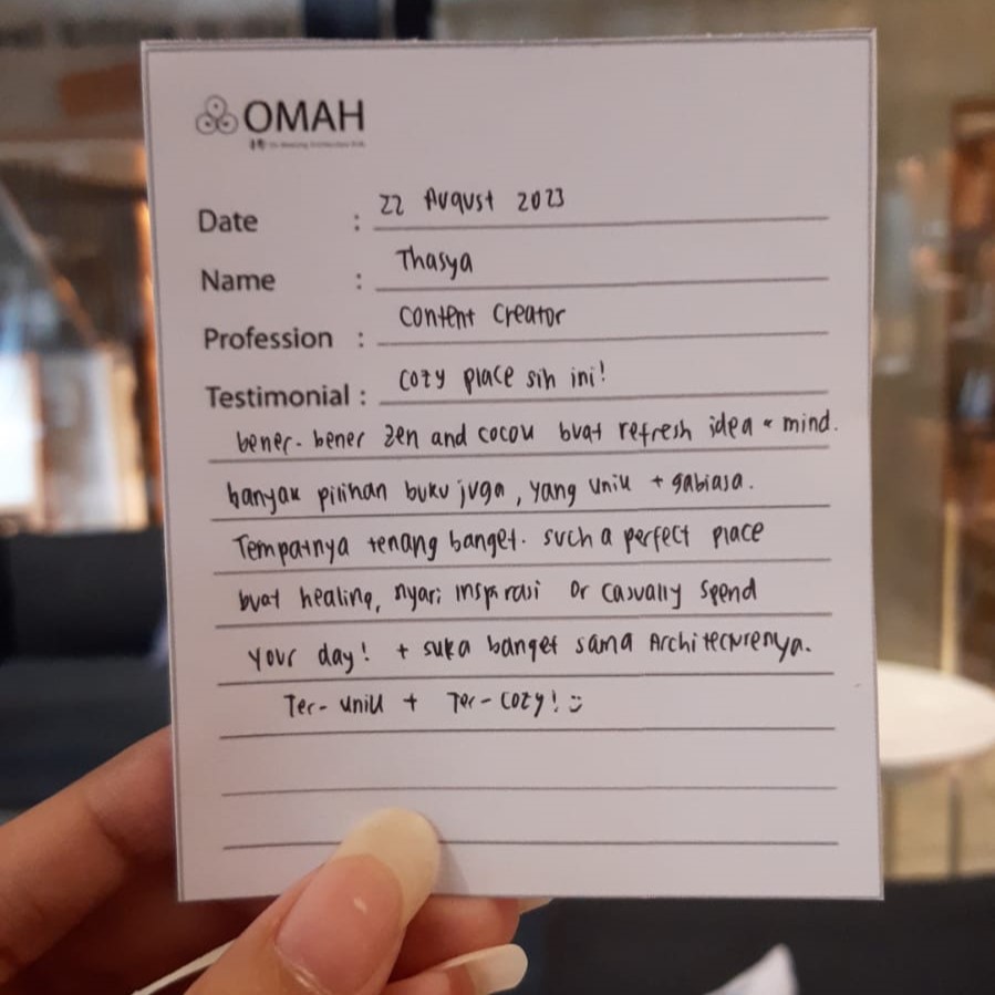 Cozy place sih ini! Bener-bener zen and cocok buat refresh idea mind. Banyak pilihan buku juga, yang unik+tidak biasa. Tempatnya tenang banget. Such a perfect place buat healing, nyari inspirasi or casually spend yourday! + suka banget sama architecture-nya. Ter-unik + ter-cozy!😊