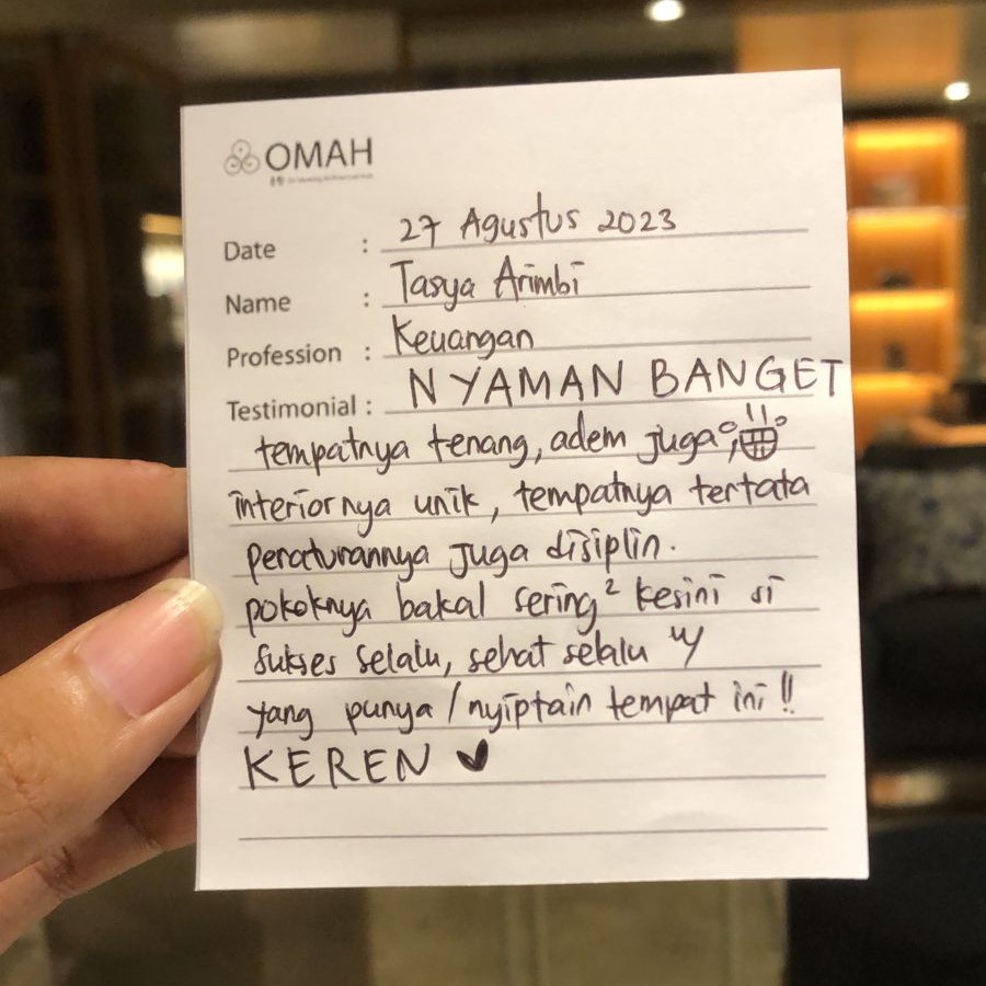 Nyaman banget. Tempatnya tenang, adem juga. Interior-nya unik, tempatnya tertata, peraturannya juga disiplin. Pokoknya bakal sering-sering kesini si. Sukses selalu, sehat selalu untuk yang punya/nyiptain tempat ini!! KEREN ❤