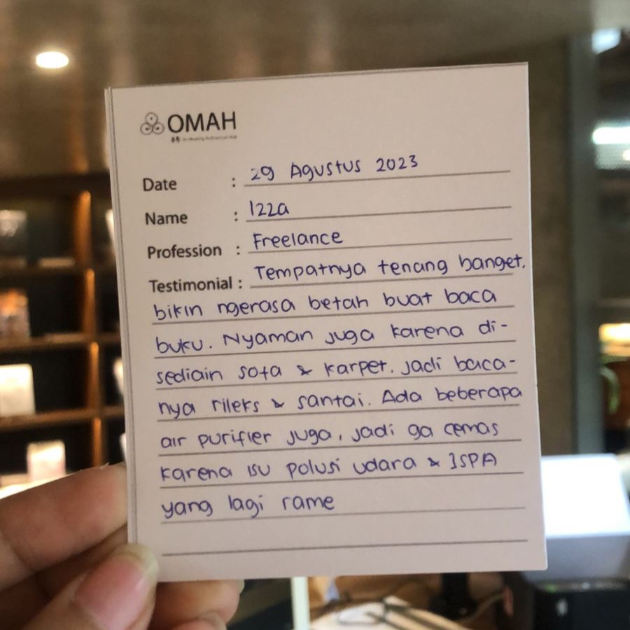 Tempatnya tenang banget bikin ngerasa betah buat baca buku. Nyaman juga karena disediain sofa & karpet. Jadi bacanya rileks & santai. Ada beberapa air purifier juga jadi tidak cemas karena isu polusi udara & ISPA yang lagi rame.