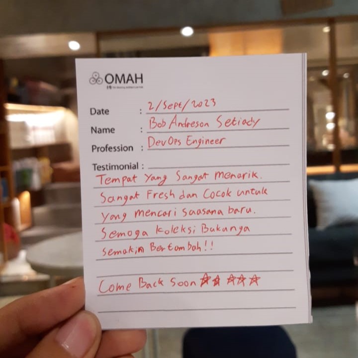 Tempat yang sangat menarik, sangat fresh dan cocok untuk yang mencari suasana baru. Semoga koleksi bukunya semakin bertambah ! Comeback soon ★★★★★