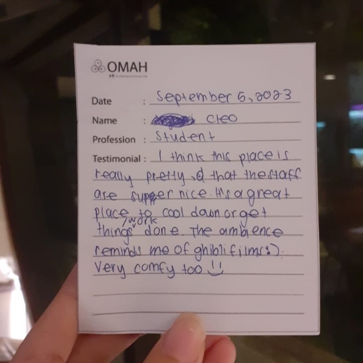 I think this place is really pretty, the staffs are super nice. It’s great place to work cool down or get things done. The ambience remind me of ghibli films 🙂 very comfy too😊