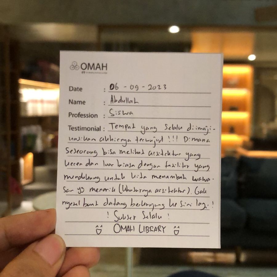 Dimana seseorang bisa melihat arsitektur yang keren dan luar biasa dengan fasilitas yang mendukung untuk kita menambah wawasan yang menarik (khususnya arsitektur). Tidak nyesel buat datang berkunjung ke sini lagi!! Sukses selalu! 😁 OMAH LIBRARY 😁