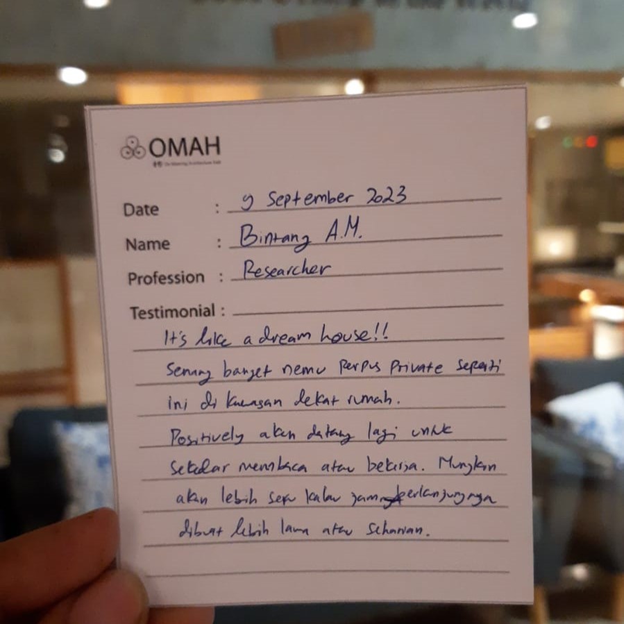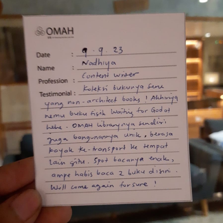 Koleksi bukunya seru yang non architect books! akhirnya nemu buku fisik waiting for god of hehe. Omah librarynya sendiri juga bangunannya unik, berasa kayak ke transport ke tempat lain gitu. Spot bacanya enak, ampe abis baca 2 buku disini. Will come again for sure!