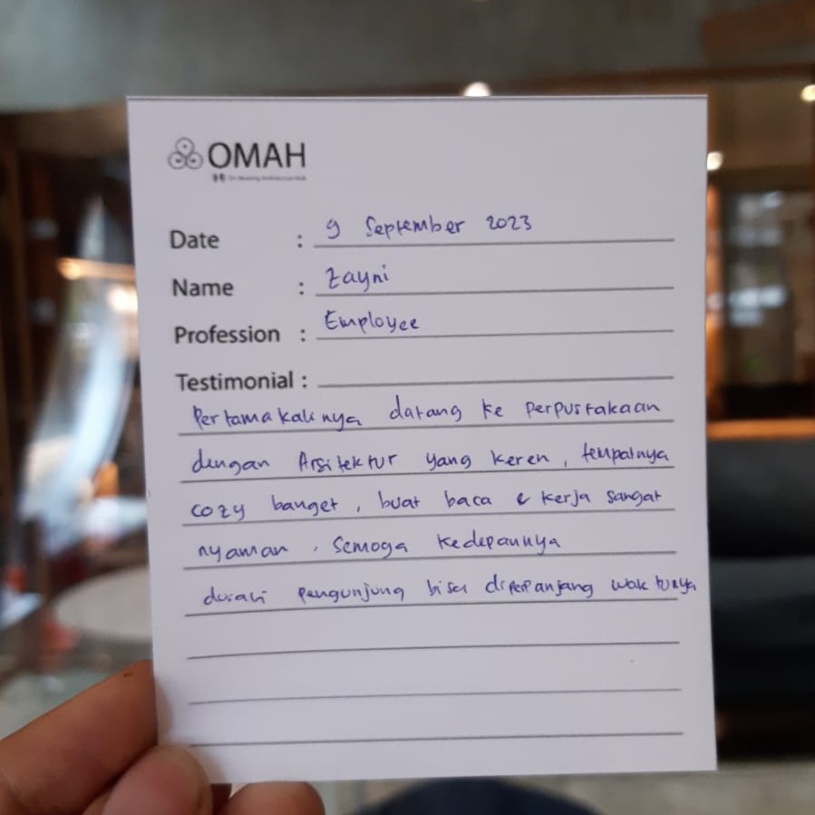 Pertama kalinya datang ke perpustakaan dengan arsitektur yang keren, tempatnya cozy banget, buat baca & kerja sangat nyaman. Semoga kedepannya durasi pengunjung bisa diperpanjang waktunya.