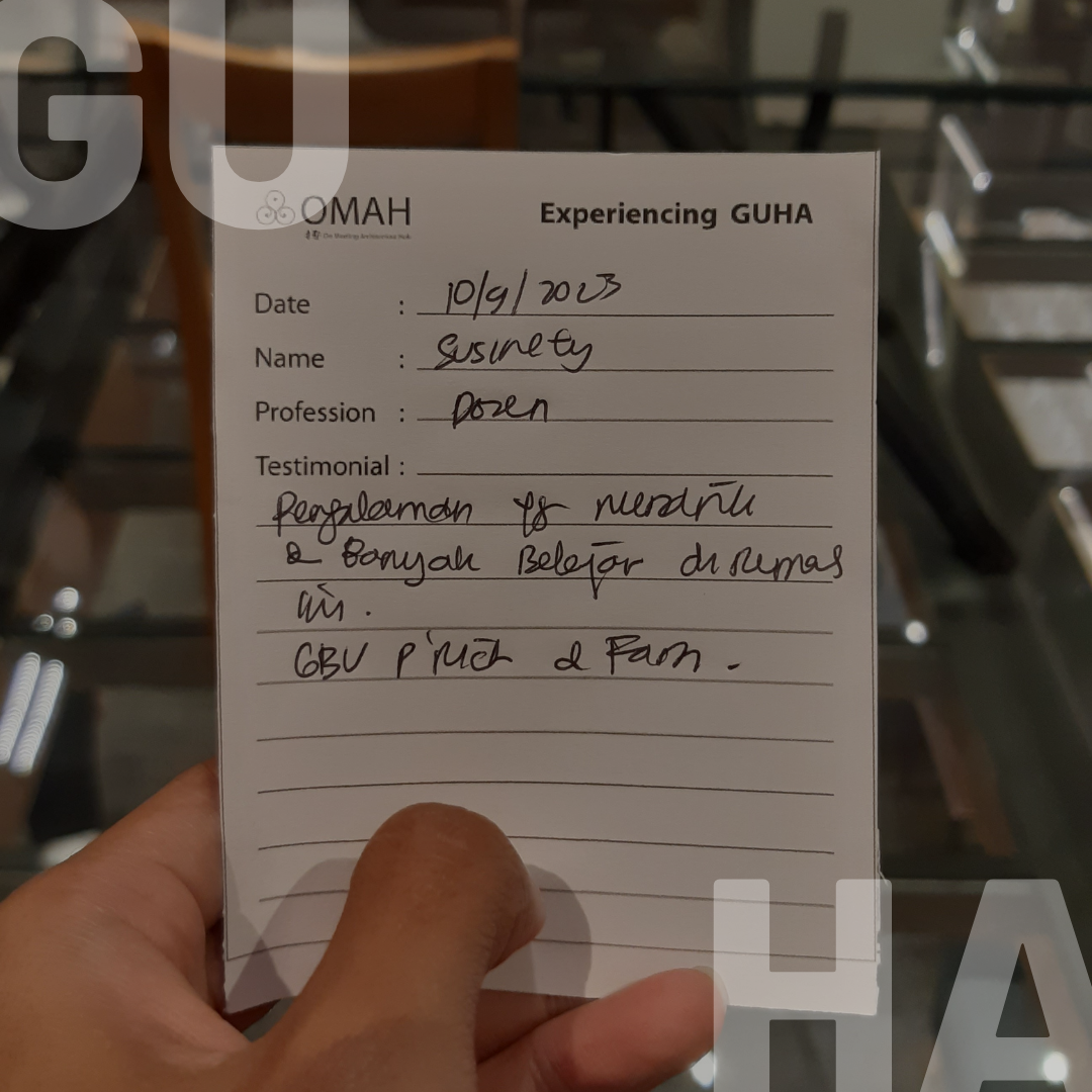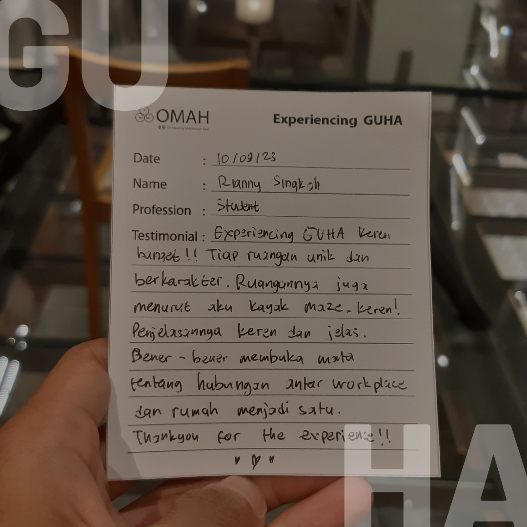 Experiencing Guha keren banget! tiap ruangannya juga menurut aku kayak maze, keren! penjelasannya keren dan jelas. Bener-bener membuka mata tentang hubungan antar work place dan rumah menjadi satu. thank you for the experience!! ❤