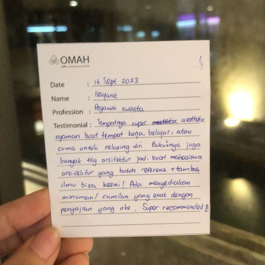 Tempat super aesthetic, nyaman buat kerja, belajar atau cuma untuk relaxing diri. Buku-bukunya juga banyak tentang arsitektur jadi buat mahasiswa arsitektur yang butuh referensi + tambah ilmu bisa kesini ! ada menyediakan minuman/camilan yang enak dengan penyajian yang oke. Super recommended!