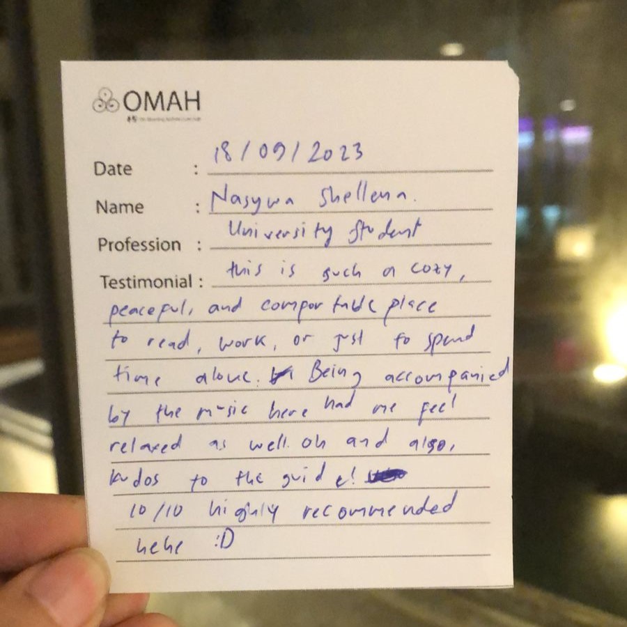 It was such a great experience. Just sitting down and calm i can feel the peace. Can wait to come back to this place again. I hope there’s more Omah place sooner ❤