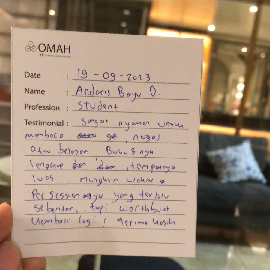 Sangat nyaman untuk membaca, nugas atau belajar. Buku-bukunya lengkap, tempat-nya luas. Mungkin waktu persesi-nya yang terlalu sebentar, tapi wort it buat kembali lagi! Terimakasih.