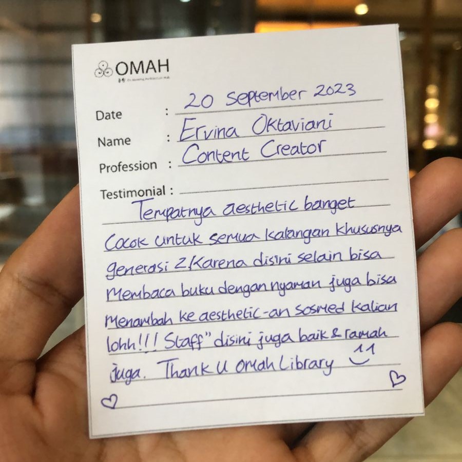 Tempat-nya aesthetic banget. Cocok untuk semua kalangan generasi Z, karena disini selain bisa membaca buku dengan nyaman juga bisa menambah ke aesthetic-an sosmed kalian lohh!! Staff disini juga baik & ramah juga. Thank you Omah Library 🙂