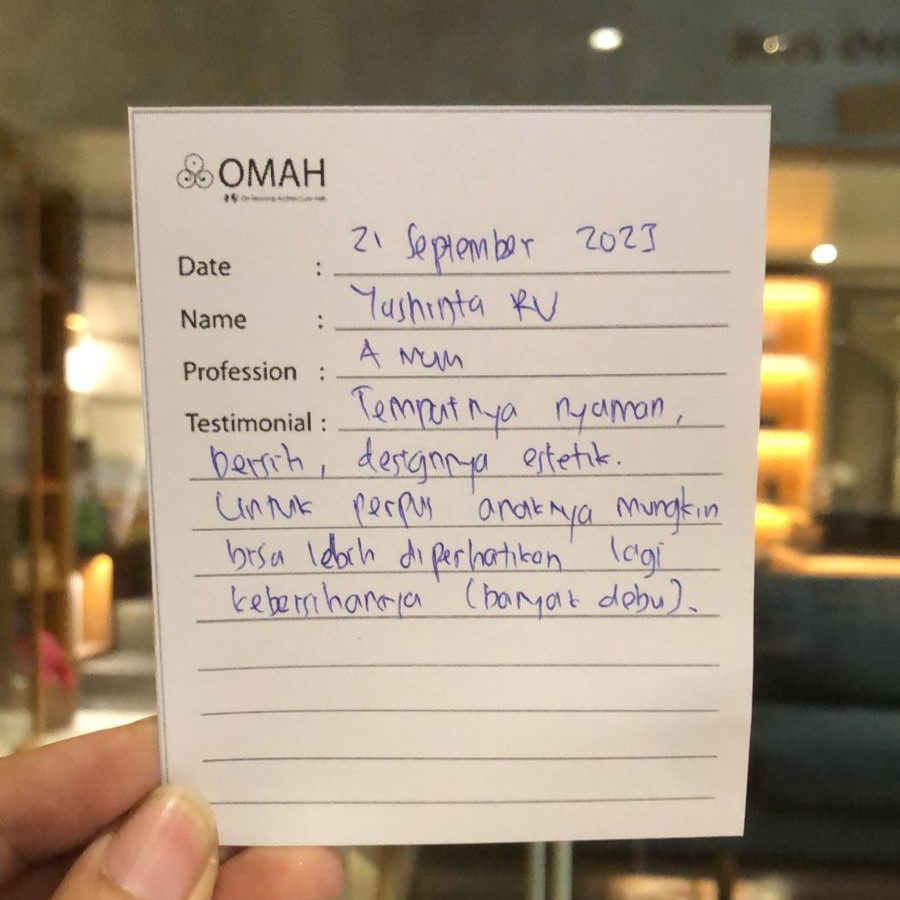 Tempatnya nyaman, bersih, design-nya estetik. Untuk perpus anaknya mungkin bisa lebih diperhatikan lagi kebersihannya (banyak debu).