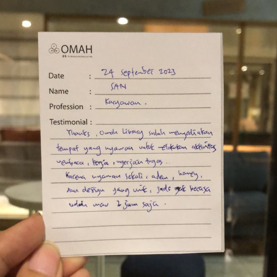 Thanks Omah Library sudah menyediakan tempat yang nyaman untuk melakukan aktivitas membaca, kerja, ngerjain tugas…karena nyaman sekali, adem, homey, dan design yang unik, jadi gak berasa udah mau 2 jam saja.