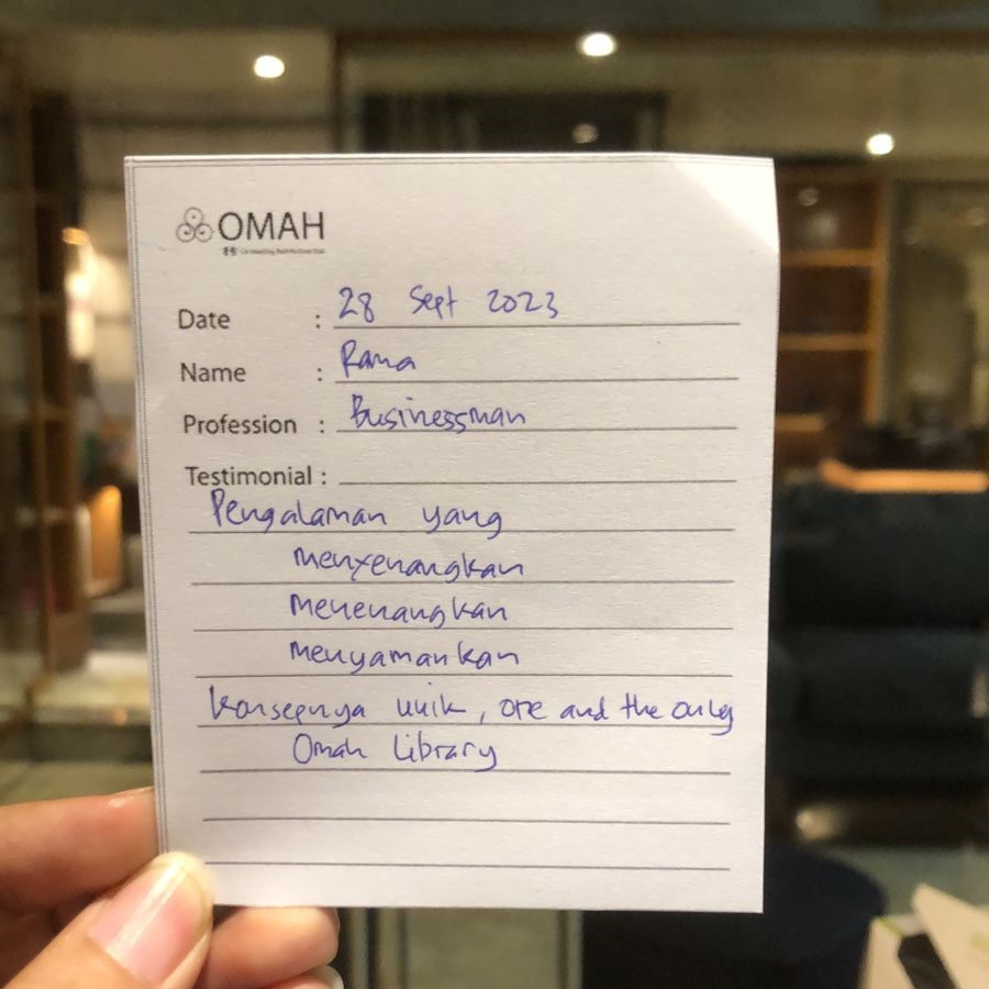 Pengalaman yang menyenangkan. Menenagkan. Menyamankan. Konsepnya unik, one and only Omah Library.