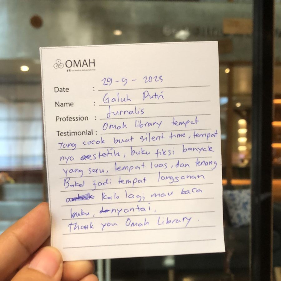 Omah library tempat yang cocok buat silent time, tempat-nya aesthetic, buku fiksi banyak yang seru, tempat luas dan tenang. Bakal jadi tempat langganan kalo lagi mau baca buku, nyantai. Thank you Omah Library.