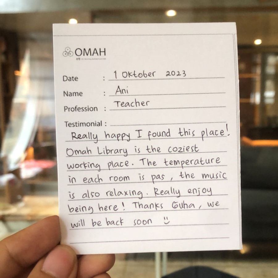 Really happy i found this place! Omah Library is the coziest working place. The temperature in each room is pas, the music is also relaxing. Really enjoy being here! Thanks Guha, we will be back soon:)