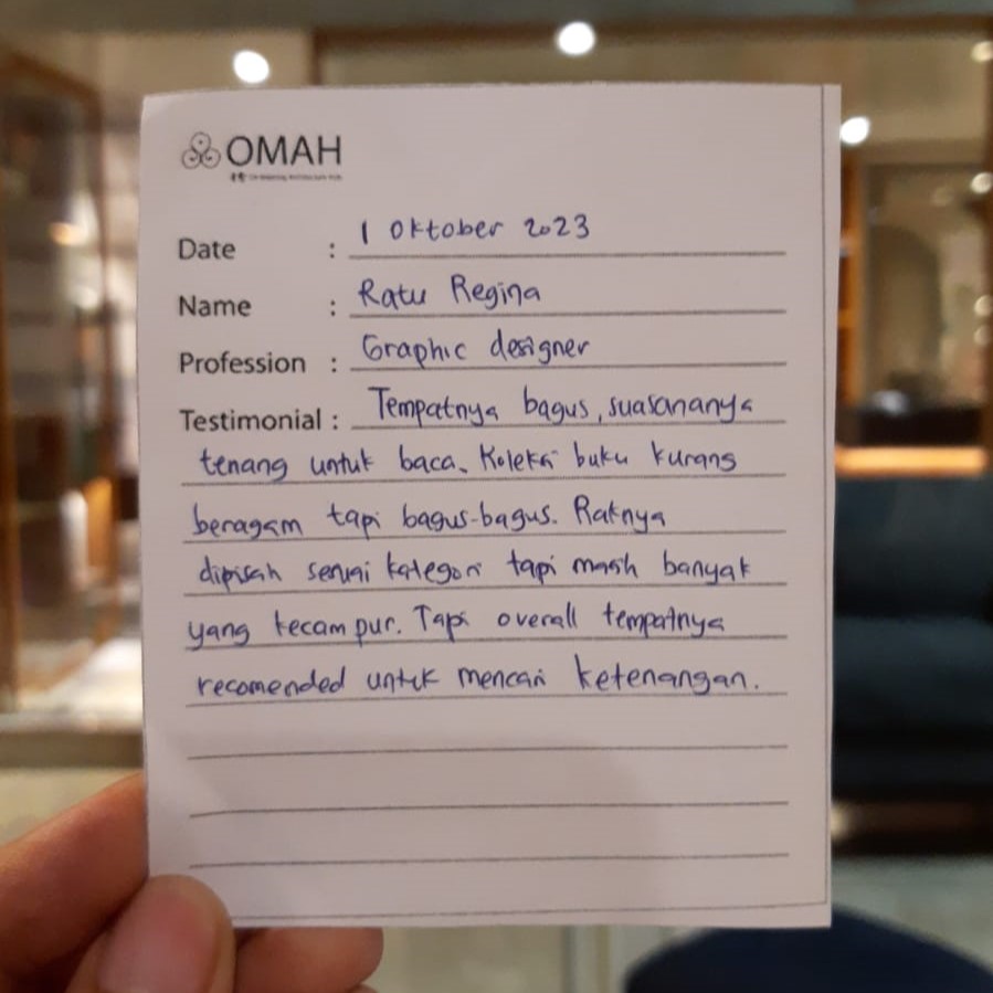 Tempatnya bagus, suasananya tenang untuk baca. Koleksi buku kurang beragam tapi bagus-bagus. Raknya dipisah sesuai kategori tapi masih banyak yang kecampur. Tapi overall tempatnya recommended untuk mencari ketenangan.