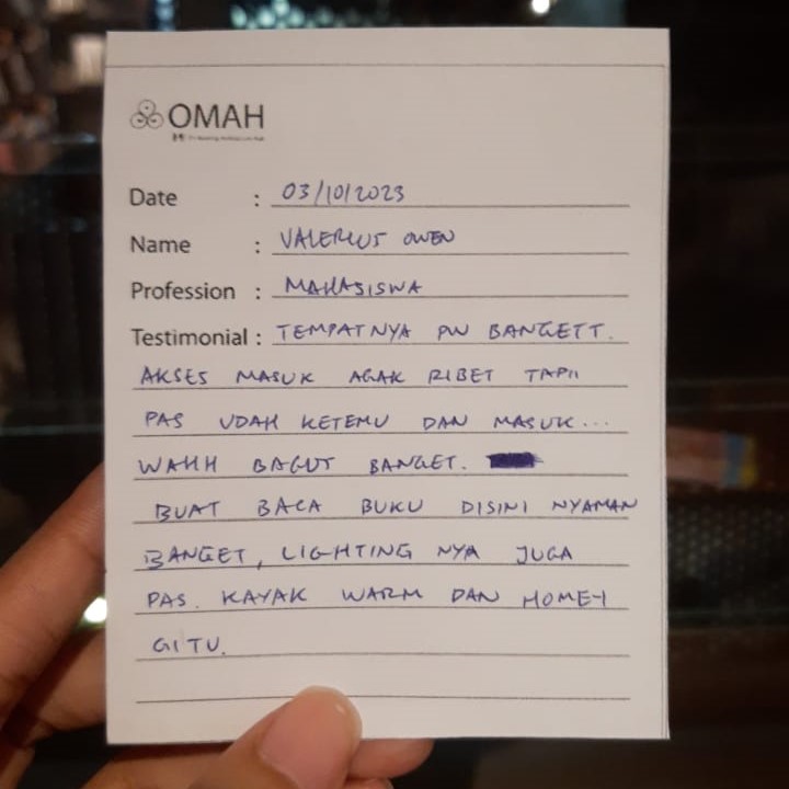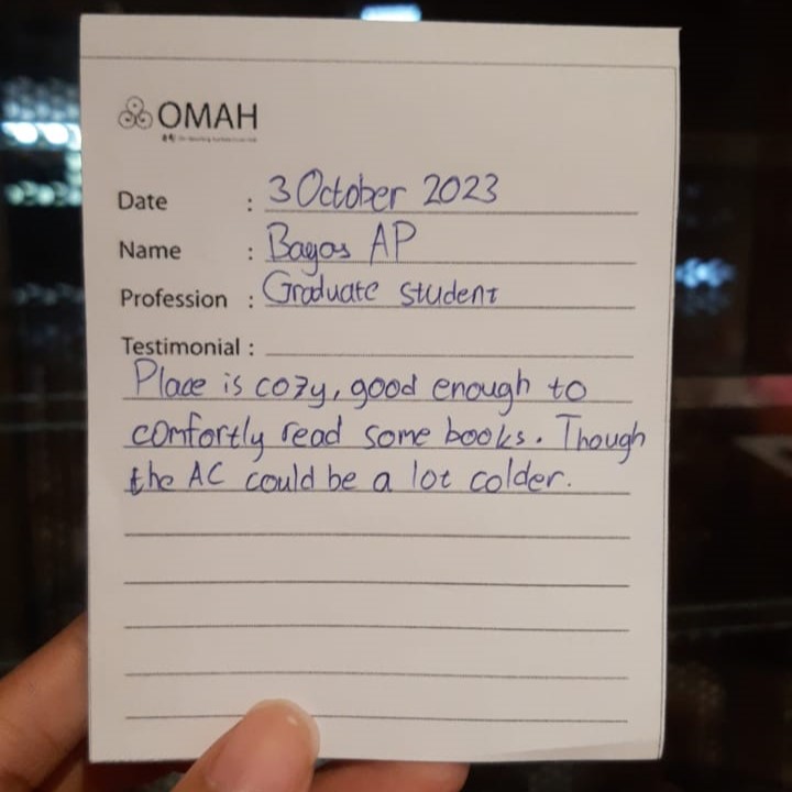 Tempat-nya pw bangett. Akses masuk agak ribet tapi pas udah ketemu dan masuk. Wahhh bagus banget. Buat baca buku disini nyaman banget, lighting-nya juga pas. Kayak warm dan homey gitu.