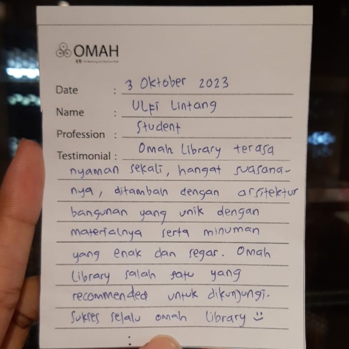 Omah Library terasa nyaman sekali, hangat suasananya, ditambah dengan arsitektur bangunan yang unik dengan materia-lnya serta minuman yang enak dan segar. Omah library salah satu yang recommended untuk dikunjungi. Sukses selalu Omah Libray 🙂