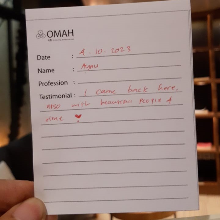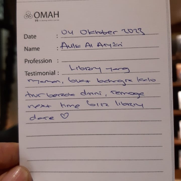 Good ambience. Tempatnya relax dan bikin santai. Tempat yang bagus untuk membaca buku yang didukung suasana dan staff yang ramah juga. Semoga Omah Library semakin berkembang maju. Thank you! ❤