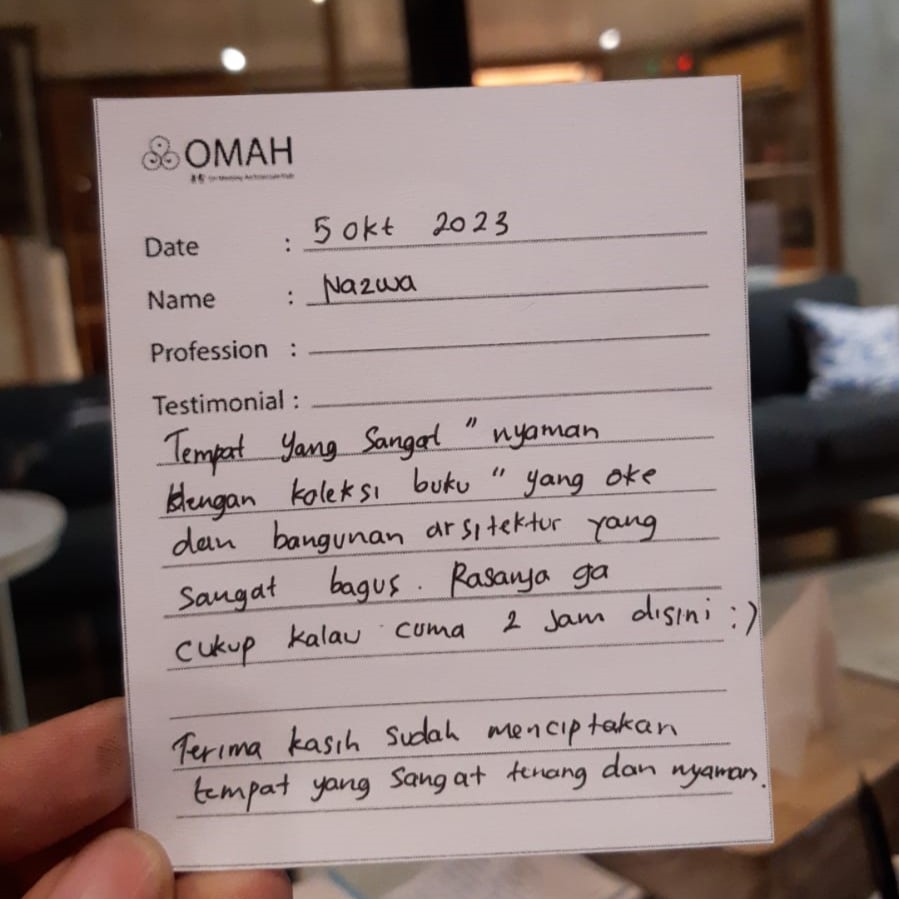 Tempat yang sangat nyaman dengan koleksi buku yang pke dan bangunan arsitektur yang sangat bagus. Rasanya ga cukup kalau cuma 2 jam disini 🙂 Terimakasih sudah menciptakan tempat yang sangat tenang dan nyaman.