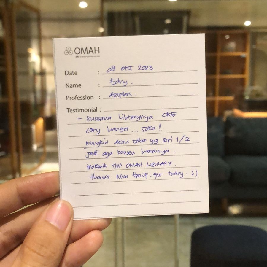 Suasana library-nya oke, cozy banget. Suka!! mungkin akan coba yang sesi 1/2 jadi aga konsen bacanya. Terima kasih tim OMAH Library. Thanks mba Hanif for today:)