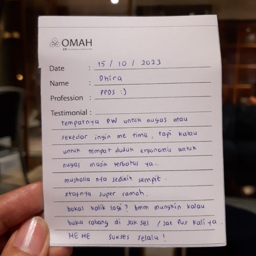 Tempatnya pw untuk nugas atau sekedar ingin me time, tapi kalau untuk tempat duduk ergonomis untuk nugas masih terbatas ya..mushollanya sedikit sempit. Staff-nya super ramah. Bakal balik lagi? hmm mungkin kalau buka cabang di jaksel/jakpus kali ya hehe. Sukses selalu!