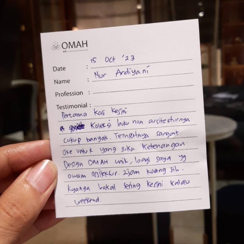 Pertama kali kesini. Koleksi buku non arsitekturnya cukup banyak. Tempatnya sangat oke untuk yang suka ketenangan. Design OMAH unik, bagi saya yang awam arsitektur 2jam kurang sih. Kayaknya bakal sering kesini kalau weekend.