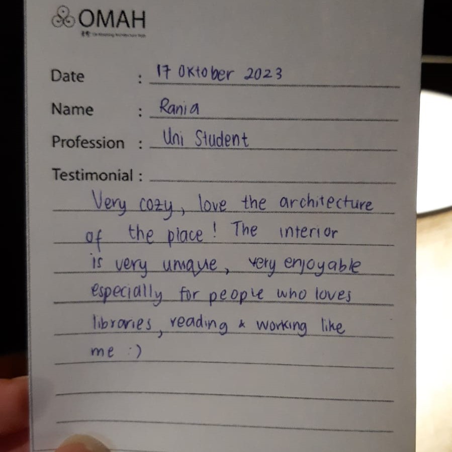 Very cozy, love the architecture of the place! The interior is very unique, very enjoyable especially for people who loves libraries, reading & working like me:)