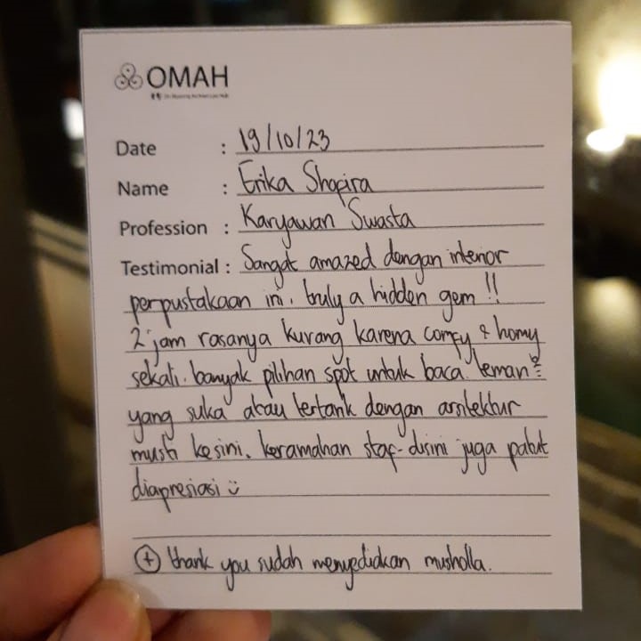 Sangat amazed dengan interior perpustakaan ini, truly a hidden gem!! 2 jam rasanya kurang karena comfy & homey sekali. Banyak pilihan spot untuk baca. Teman-teman yang suka atau tertarik dengan arsitektur musti kesini, keramahan staff disini juga patut diapresiasi:)