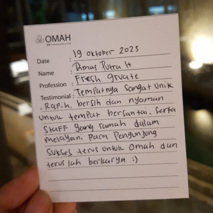 Tempatnya sangat unik, rapih, bersih dan nyaman untuk tempat bersantai. Serta staff yang ramah dalam melayani para pengunjung. Sukses terus OMAH dan teruslah berkarya:)