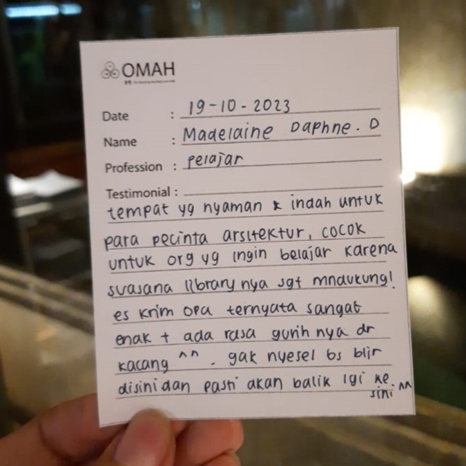 Tempat yang nyaman & indah untuk para pecinta arsitektur, cocok untuk orang yang ingin belajar karena suasana library-nya sangat mendukung! Es krim opa ternyata sangat enak + ada rasa gurihnya dari kacang. Gak nyesel bisa belajar disini dan pasti akan balik lagi kesini.